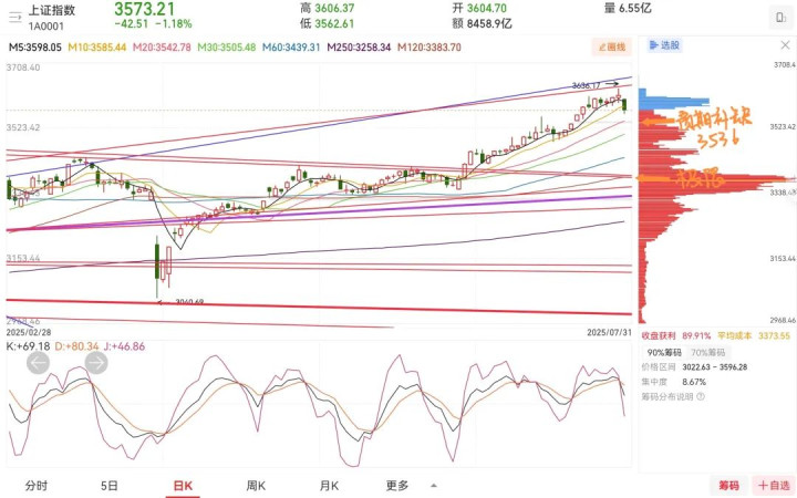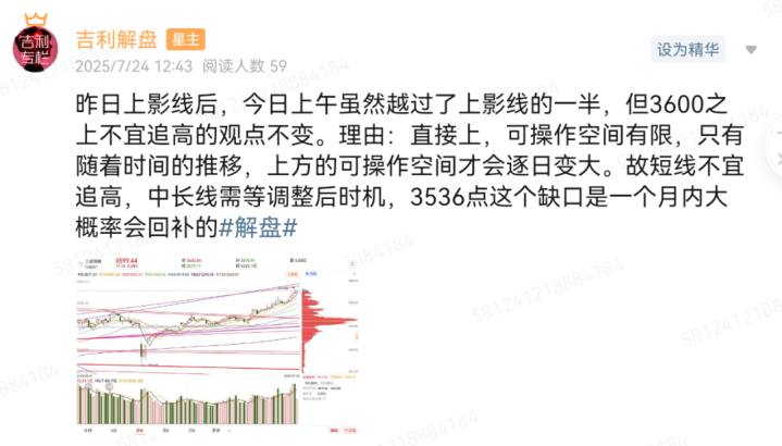 后续行情节奏与预判高度吻合:7月23日上证指数如期触及3600点,自此之后,每日解盘均反复提示“3600点之上不追高”,并强调下方3536点的缺口在一个月内大概率会回补,为短期操作划定了清晰的风险边界。